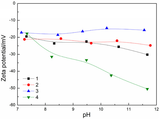 Effect of different adding orders on zeta potential of magnesite particles in the presence of Ca2+: (1) MgCO3 + Ca2+ + Na2CO3 + SH; (2) MgCO3 + Ca2+ + Na2CO3 + SH + NaOL; (3) MgCO3 + Ca2+ + SH + Na2CO3; (4) MgCO3 + Ca2+ + SH + Na2CO3 + NaOL (C(Ca2+) = 20 mg/L; C(SH) = 20 mg/L; C(NaOL) =120 mg/L).