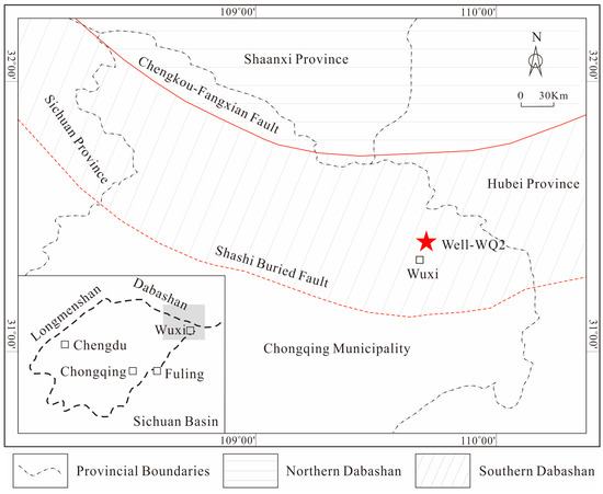 The northeastern Sichuan Basin covers most parts of the Chongqing Municipality in SW China and some parts of the Sichuan, Shaanxi, and Hubei Provinces (Figure 1). The history of tectonic activity can be divided into three periods: from the Mesoproterozoic to the Neoproterozoic (1600 to 800 Ma), from the Nanhua Period to the Triassic (800 to 200 Ma), and after the Jurassic (since 200 Ma) [12]. These periods of tectonic activity have resulted in the formation of an arc tectonic belt system with a thrust belt trending to the southwest in the northeastern Sichuan Basin (Figure 1). The Chengkou-Fangxian Fault is a typical example of the tectonics in this region. It divides the Dabashan arc-like thrust fold belt into the northern- and southern-Dabashan regions (Figure 1) [24,25]. The study area is located in the southern Dabashan region (Figure 1).