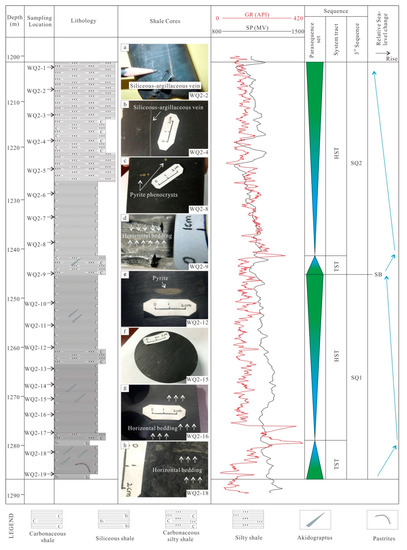 In SQ1, the TST is characterized by siliceous shale and carbonaceous shale with a horizontal bedding texture (Figure 3h). The siliceous shale is rich in Si-minerals (>85%) and is associated with high hardness values. The carbonaceous shale is an organic-rich shale that is usually black in color and contains a high quartz content (>50%) and low clay mineral content (<20%). In the TST, Akidograptus and Pastrites are common and randomly oriented in both shales (Figure 4a,b). In the HST, a horizontal bedding texture is common in the pure carbonaceous shale (Figure 3f) and is sometimes observed in the carbonaceous silty shale (Figure 3g). The carbonaceous silty shale is gray or dark gray in color with moderate contents of organic matter, quartz (~50%), and clay minerals (20~30%). Compared with the TST, the HST has fewer graptolites (mostly Akidograptus) (Figure 4c). In SQ1, almost all the cores are black and dark gray shale, with some pyrite present (Figure 3e).