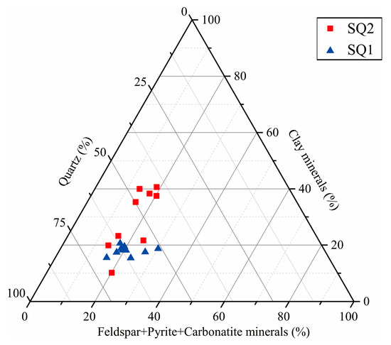In both SQ1 and SQ2, the mineral composition of the LSL shale includes quartz, feldspar, pyrite, carbonate, and clay minerals (Figure 5 and Figure 6). The contents of pyrite and carbonate exhibit unobvious vertical variations. The quartz content in SQ1 (average of 61.0%) is higher than that in SQ2 (average of 52.6%) (Figure 5 and Figure 6), while the clay mineral content in SQ1 (average of 18.0%) is lower than that in SQ2 (average of 29.6%) (Figure 5). The vertical heterogeneity of the mineral composition in SQ1 is more homogeneous than that in SQ2 (Figure 6) due to less water movement and more homogeneous sedimentary inputs in SQ1 [7].