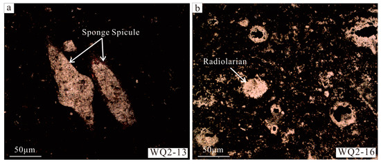 The relationship between the TOC content and the quartz content has been used in analyses of the sedimentary environment. According to observations of Devonian shales in Canada [35] and Lower Silurian shales in China [36], the TOC content increases with the quartz content, which indicates that biogenic quartz is present in these shales and that quartz and TOC are both mainly derived from siliceous organisms. Similarly, in the study area, the TOC content of LSL shale displays a moderate positive correlation with the increase in the quartz content, excluding sample WQ2-18, which exhibited an extremely high value of 8.46% (Figure 7). This suggests that abundant biogenic quartz is likely present in the LSL shale in the northeastern Sichuan Basin. This may result from the involvement of siliceous organisms such as siliceous radiolarian, sponge spicule, and diatoms in the sedimentation process. This theory is confirmed by microscopic observations of the LSL shale collected from Well-WQ2 (Figure 8).