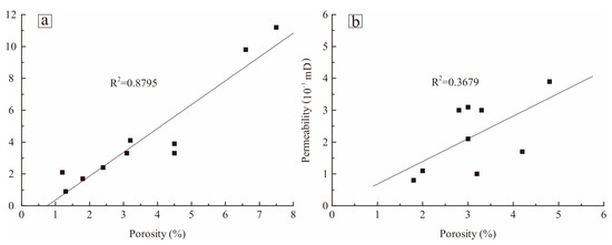 Relationship between the porosity and permeability of the shales from (a) SQ1 and (b) SQ2.
