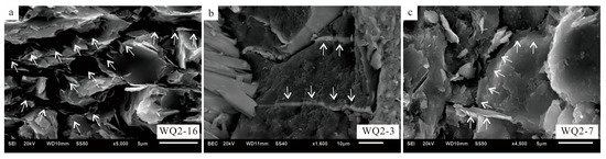 Scanning electron microscope (SEM) images showing fractures and mineral filling. (a) Well-developed microfractures system and good connectivity between intergranular pores; (b,c) Microfractures filled by certain minerals and poor connectivity between intergranular pores.
