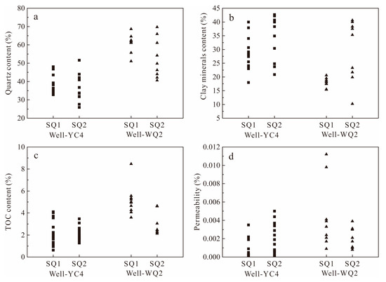 There lies a similar law about the vertical variation of reservoir parameters from SQ1 to SQ2 in different shale gas wells [7,8,9]. Taking Well-WQ2 and Well-YC4 as examples, SQ1 has higher quartz and TOC contents but a lower clay mineral content than SQ2 (Figure 11a–c). However, a slight difference exists as well. SQ1 exhibits a lower permeability than SQ2 in Well-YC4, whereas the situation in Well-WQ2 is just the opposite (Figure 11d).