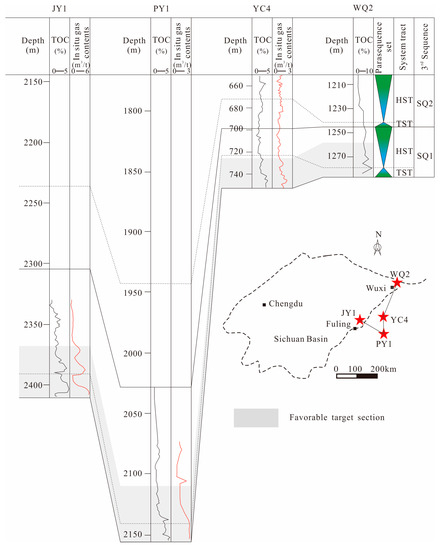 The sequence framework of LSL shale in different wells exhibited that both vertical heterogeneity and lateral heterogeneity commonly exist in LSL shale in and around Sichuan Basin (Figure 12). Vertically, the TOC content and the in situ gas content are variable from SQ1 to SQ2 in each shale gas well. Horizontally, reservoir parameters such as burial depth, strata thickness, and TOC content are heterogeneous in the same third-order sequence of different wells. Nevertheless, a general rule can be identified in that the lower section of SQ1 contains the highest TOC content for all wells and the highest in situ gas content for the referenced wells (Well-JY1, Well-PY1, and Well-YC4) (Figure 12). In the southeastern Sichuan Basin, practical experience demonstrates that SQ1 is the current commercial shale gas production interval for its high gas yield [7]. For example, the horizontal well (length of 1008 m) of Well-JY1 was drilled at an equivalent depth of 2385~2415 m (lower section of SQ1), which got a shale gas yield of 6 × 104 m3/d on average in the first year of trial-production [39].