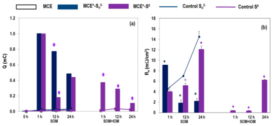 Figure 1. Changes the interfacial charge transfer or Q (a), and resistance to noise, Rn (b) in massive chalcopyrite electrodes (MCE)*-Sn2− (blue) and MCE*-S0 (purple) surfaces after biooxidation assays with sulfur-oxidizing microorganism (SOM) (left) and SOM+ iron-oxidizing microorganisms (IOM) (right) at the assayed times (0 h or initial condition, 1, 12 and 24 h). Data: Average values (n = 3) and standard deviation (error bars). *: Values significantly different (p < 0.05) for both, control and surficial RSS (Sn2− or S0).