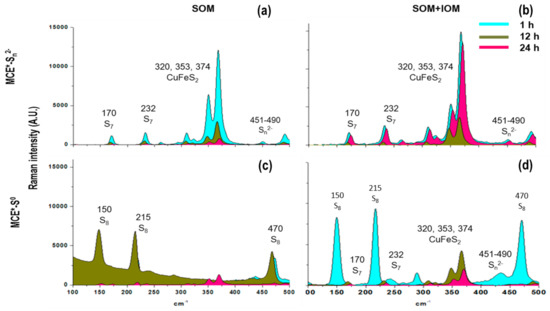 Figure 2. Identified Raman transitions peaks in terms of main surficial reduced sulfur species (RSS) on MCE*-Sn2− interacting with SOM (a) and on MCE-S0 with SOM and SOM+IOM (b,c) after the assayed times: 1 (blue), 12 (red) and 24 h (green). Abiotic controls (d).