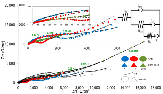 Figure 4. Nyquist diagram for MCE*-S0 in presence of SOM (triangle) and SOM+IOM (circle) after the assayed times: 1 (blue), 12 (red) and 24 h (green). The equivalent circuit is also presented. Rsol: Resistance of the solution (electrolyte); Clayer and Rlayer: Effective capacitance activity and resistance on the MCE*-S0/biofilm interface, respectively; Cdl and Rct: Charge redistribution and resistance on the interface, respectively; W: Warburg impedance.