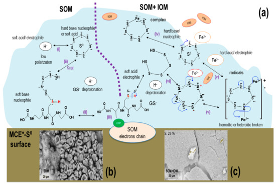 Figure 5. Proposed model of S0 (bio)oxidation by A. thiooxidans alone or with the IOM, Leptospirillum sp. (a) (i) Cyclic S0 behaves as a hard base; thus, the presence of H+, is not sufficient to favor a reaction affinity. (ii) Although the deprotonated glutathione (due to the acid medium) GS- acts as a soft and nucleophilic base and may form GS-SnH, it has been reported that Kcat for this reaction is very low. (iii) GS-SnH is transported to the SOM periplasm via the outer membrane protein (OMP). The GSH catalyst is regenerated. In the presence of IOM, S0 as a hard-base shows affinity for the produced Fe3+ that is also a polarizing agent. Thus, Fe3+ may induce a S0-Fe3+ complex formation and/or (iv–vi) charge delocalization, until it rises to a linear Sn2− that interacts with the GS to form GS-SnH, available for SOM, as already mentioned (iii). Agglomerated reduced sulfur species (RSS) (b) and thin and spongy layer (c) after SOM and SOM+IOM biooxidation of MCE*, respectively [15,29,30,32,33].