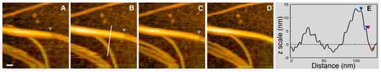 (A–D) Time lapse of the protofibril elongation stacked on top of a fibril. The grey arrowheads indicate the edge of the elongating protofibril on top of a fibril. (E) The profile (corresponding to the white line in (B)) indicates that only two fibers are stacked on top of each other. Images were collected successively separated by 1 s. Scale bar: 30 nm. Adapted from Ref. [99].