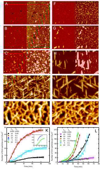 - Watanabe-Nakayama, T.; Ono, K.; Itami, M.; Takahashi, R.; Teplow, D.B.; Yamada, M. High-speed atomic force microscopy reveals structural dynamics of amyloid β1–42 aggregates. Proc. Natl. Acad. Sci. USA 2016, 113, 5835–5840. [Google Scholar] [CrossRef] [PubMed]