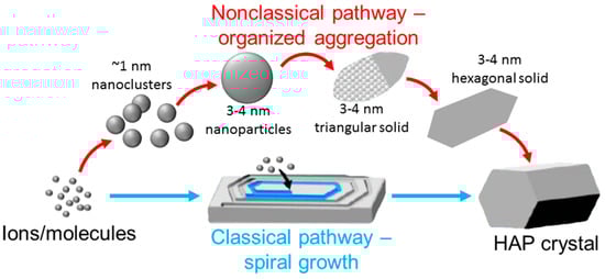 Classical and nonclassical pathways for hydroxyapatite (HAP) crystallization. In the classical pathway, monomeric species (ions or molecules) are added at step edges during spiral growth, while in the nonclassical pathway, HAP crystals grow by the attachment of different size particles (~1 nm or 3–4 nm in height) to form organized, but may be amorphous, assemblies/aggregates with triangular and hexagonal morphologies.