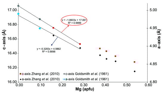 The experimental data of Goldsmith et al. [] and Zhang et al. [] related the Mg for Ca substitution in magnesian calcite to the lattice parameters a and c. Both relations are linear up to 0.287 Mg apfu, but the linearity does not extend to higher substitutions (Figure 1). The c axis correlates better, through the Equation: