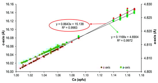 McCarthy et al. [] present a similar approach for non-stoichiometric dolomite. The relationship between both of the crystallographic axes a and c of dolomite and the molar fraction of excess Ca, allocated on the B site of the mineral, is presented in Figure 2. Only Mg occupies the B site when the dolomite is stoichiometric. As for calcite, the c axis achieves a better correlation (factor of 0.9983), and relates to the excess Ca in the B site ΔnCa by Equation (2):