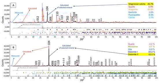 Refinement result for samples with the abundant (A) magnesian calcite in sample AC3623 and (B) non-stoichiometric dolomite in sample C14. The blue and red curves are measured and calculated diffraction pattern, respectively. The black curve is the diffraction pattern for the highlighted mineral. The gray curve is the residue of the refinement, followed by the position of the crystallographic reflections of quantified minerals following order and color code of the list in the upper right corner. The miller indexes for reflections refer to the highlighted minerals in (A,B).