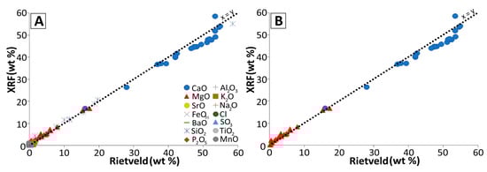 Conciliation of the chemical composition derived from mineral quantification by the Rietveld method (XRD) against XRF analyses (wt %). (A) Data for all analyzed elements. (B) Data only for Ca and Mg. Data in Tables S2 and S3.