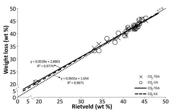 The results of the Rietveld method refinement were further checked against C measured by the elemental analysis and CO2 determined by thermogravimetry under CO2 atmosphere, which separates the thermal events of mass loss of the carbonate from the magnesite molecule due to dolomite from calcite [], in Figure 5.