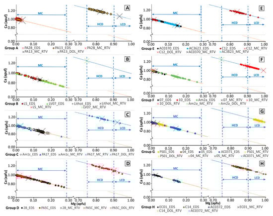 Results of energy-dispersive X-ray fluorescence spectrometer (EDS) analyses represented by circles, triangles, and diamonds, as compared to the Rietveld method (RTV) results represented by X, for magnesian calcite (MC), low calcium dolomite I (LCD), and high calcium dolomite II (HCD). (A–H) Different groups of samples separated for clearer visualization. Data in Table S5.
