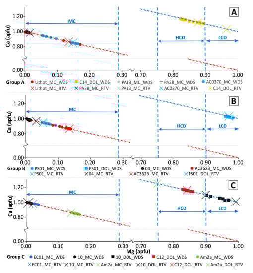 Results of EMPA (WDS) analyses represented by circles, triangles and diamonds, compared to the Rietveld (RTV) method represented by X for magnesian calcite (MC), dolomite I (LCD) and dolomite II (HCD). (A–C) Different groups of samples separated for clearer visualization. Data in Table S6.