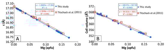 Comparing correlation of lattice parameters for magnesian calcite of this study (in blue) and of Titschack et al. [] (in red). (A) Correlation between crystallographic axis c and molar fraction of MgCO3; (B) Correlations between cell volume and molar fraction of MgCO3.