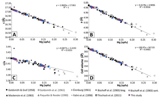 Plot of Mg content in magnesian calcite against lattice parameters from published data. Data of our study are represented as blue squares with red border. The equation of the line and correlation coefficient R2 refers to the data of our study. (A) Correlation of the length of crystallographic axis c and molar fraction of MgCO3; (B) Correlation of the length of crystallographic axis a and molar fraction of MgCO3; (C) Correlation of ratio c/a of the crystallographic axes and molar fraction of MgCO3; and, (D) Correlation of cell volume and molar fraction of MgCO3.
