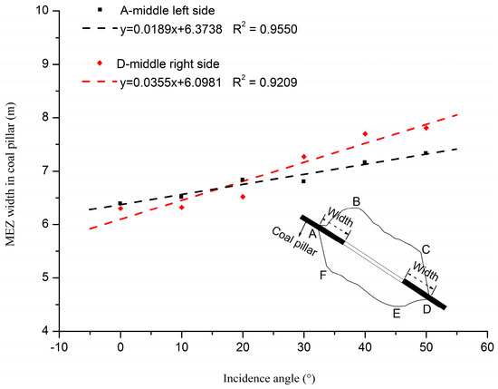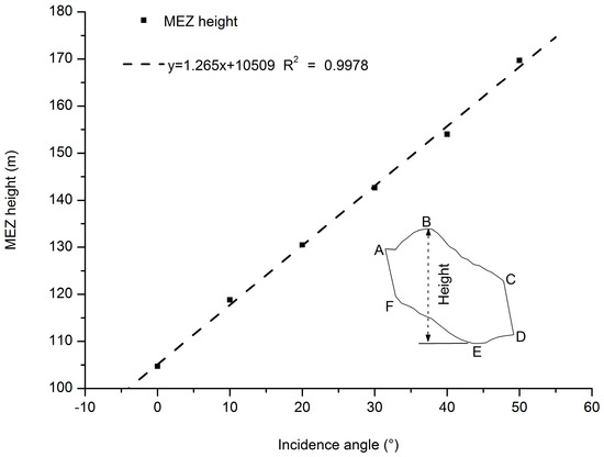 - The MEZ range above the mined seam is larger than that below the mined seam for different coalbed angles. The effect of coal seam angle on the MEZ distribution range is minimal. As the coal seam angle increases, the MEZ range in the roof decreases, whereas the MEZ range in the floor increases. The MEZ widths in the upper and lower coal pillars of gobs increase as the coalbed angle increases, and the MEZ width in lower pillar increases faster.