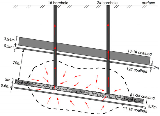 - Qu, Q.D.; Guo, H.; Loney, M. Analysis of longwall goaf gas drainage trials with surface directional boreholes. Int. J. Coal Geol. 2016, 156, 59–73. [Google Scholar] [CrossRef]