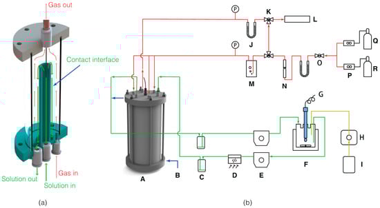 Schemes of the experimental setup for CO2 absorption and Mg-carbonate precipitation kinetic study: (a) Core of the modified wetted-wall column (part A), achieving gas absorption into solution through a measurable contact layer; (b) parts that constitute the whole experimental system (A: wetted-wall column; B: circulating water; C: damper; D: spectrophotometer; E: peristaltic pump; F: jacket reactor; G: pH electrode with temperature sensor; H: high-performance liquid chromatography (HPLC) pump; I: reactant tank; J: dehydration; K: three-way valve; L: gas analyzer; M: saturator; N: rotameter; O: needle valve; P: mass flow meter; Q: CO2 cylinder; R: N2 cylinder).