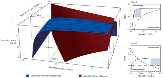 Saturation index SI, logΩ of nesquehonite and brucite versus concentrations of TC and TN. The 3D surface graph on the left shows that with careful chosen of solution composition, nesquehonite can be kept oversaturated (SI > 0) while brucite can be kept undersaturated (SI < 0). The 2D lines on the right (slice 1 and slice 2) indicate the preferred solution chemistry (shaded area) to produce pure nesquehonite at constant TC (0.1 , slice 1) or TN (0.4 , slice 2). Mg concentration is set as 0.10 , and temperature is 25 °C.