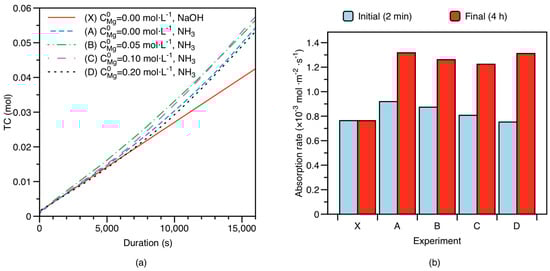Figure 3a shows how the total carbon absorbed (TC) evolves over time under variable initial Mg concentrations from 0.00 to 0.20 . The overall trends of TC evolution with time are similar despite the varying Mg concentrations. The averaged initial absorption rate (for the first two minutes of absorption, Figure 3b) of those experiments is 8.38(74) × 10−4 , close to that of NaOH absorption baseline (experiment X, 7.70 × 10−4 ). The instantaneous CO2 absorption rate increases over time in the NH3 system but not in the NaOH system. The averaged final absorption rate (in a span of four hours) between experiment A–E is 1.28(4) × 10−3 , which is almost double that of experiment X (also 7.70 × 10−4 ). The increased CO2 absorption rates over time indicate kinetic accelerations of the CO2–NH3–MgCl2 system. The normalized deviations in both initial and final absorption rates over experiments A–E, 8.8% and 3.5%, respectively, are insignificant, suggesting that changing initial Mg concentration has a limited effect on the CO2 absorption. The initial Mg concentration does seem to affect the timing of nesquehonite’s first occurrence. As shown in Table 1, no Mg-carbonate appears when Mg concentration is zero, and a higher initial Mg concentration shortens the time lag of nesquehonite precipitation (from 3.6 h at 0.05 to 2.2 h at 0.2 ). Another interesting observation is that experiments A–E all have similar, smooth, and continuous TC-time curves, suggesting that precipitation does not seem to lead to abrupt change in the absorption process.