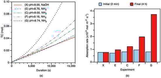 Figure 4a shows the TC-time curves for experiments C, E, F and G under the same initial Mg concentration ( = 0.10 ) but different pH values (from 8.76 to 9.74). Different from Figure 3a, the TC-time curves in Figure 4a separate from each other more significantly, pointing to a stronger pH effect on CO2 absorption kinetics.