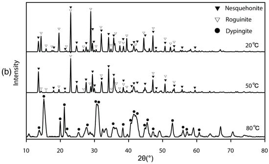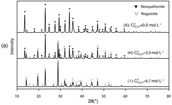 In solutions without initial NH4Cl addition (experiments A–G), nesquehonite is the main precipitate, as revealed by XRD (Figure 5 and Table 1). However, with higher initial NH4Cl concentration (>2 ), roguinite starts to form (Figure 5a). Pure roguinite appeared when initial NH4Cl reached 6.7 mol L−1, but transformed to nesquehonite at 20–50 °C (Figure 5b) and dypingite at 80 °C when washing at such a temperature.