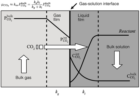 To link the CO2 absorption rate to reaction kinetics, a “two-film” model is adopted to describe the mass transfer process. Figure 7 illustrates the concept of this model. In essence, the diffusion film on the gas side and the solution side determine the efficiency of mass transfer. In this framework, the rate of CO2 absorption () can be written as: