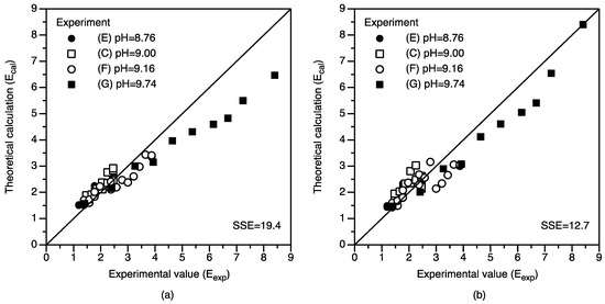 The intercept and slope of Equation (26) are obtained through fitting to With this correction, the fit between and is significantly improved (with a smaller sum of squared errors, or SSE), especially when (Figure 8). Notably, the linear form of Equation (26) is similar to the rate constant expression of Equation (3) developed within a “termolecular mechanism” frame, where the initial product is not zwitterions but a loosely bounded termolecular complex involving CO2, ammonia, and base molecules [73,74,75].