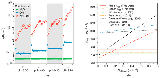 As discussed in Section 4.2.1, three reactions (Equations (1)–(3)) are contributing to CO2 mass transfer on the solution side. Figure 9a shows the individual rate constant of these reactions in a pseudo first-order form (i.e., for ; for ; for NH3). The rate constant of Equation (1) is fixed at for experiments C, E, F, and G as we set the temperature and water concentration to be constant. Similarly, the rate constant of Equation (2) for any specific experiment is constant, but shows a positive correlation with solution pH among the different experiments (from 0.064 of experiment E, to 0.615 of G). The rate constant of OH− is ~3–30 times larger than H2O. The rate constant of NH3(aq) is highest, up to 431 (Figure 9a), thus the CO2–NH3 reaction should be the dominant reaction among reactions (1)–(3). As discussed in Section 4.2.1, the reaction rate between CO2(aq) and NH3(aq) increases with NH3(aq) concentration through enhanced reaction rate and greater apparent rate constant (Equations (19) and (26), Figure 9b). Thus, higher NH3(aq) concentration would facilitate CO2 mass transfer on the solution side, either through increasing the total ammonium nitrogen concentration (e.g., adding ammonium salts) or raising the pH.