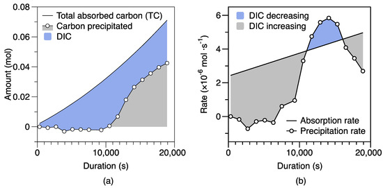 Rate of CO2 absorption () and nesquehonite precipitation ( ) in experiment C: (a) Temporal evolution of amount of CO2 absorbed and nesquehonite precipitated. The space between two lines is the amount of CO2 preserved in the solution as DIC. (b) Rate of absorption vs precipitation. CO2 is efficiently converted to nesquehonite when .