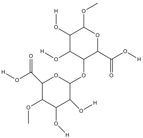 Due to its biodegradability, non-toxicity, gelation, etc., using of alginate seems like a very good solution. Also, it is widely used in medical, pharmaceutical, and food applications [9], and shows high affinity for heavy metals, especially for lead [10,11,12]. The major component of the alginate is alginic acid, (1,4-linked β-d-mannuronic and α-l-guluronic acids), which structural formula is given in Figure 1.