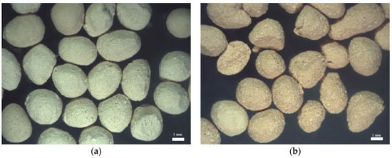 Natural and Fe(III)-modified zeolite-alginate composites were prepared using a method described by Yuan and Viraraghavan [21]. A 2% polymer solution was prepared by dissolving 2 g of sodium alginate in 100 cm3 of distillated water and then agitated for 24 h at 300 rpm to make a homogenous polymer solvent mixture. Then, 10 g of the natural or Fe(III)-modified zeolite was blended with 100 cm3 of 2% w/v sodium alginate solution for 2 h, in order to make beads with zeolite loadings of 10%. Spherical beads were prepared by dropping the mixed solution into 0.1 mol/dm3 CaCl2 solution cooled to the temperature 4–8 °C. Beads that were 3–5 mm in diameter were formed by drop-wise extrusion through a pipette tip. The beads were hardened by placing them in 2% solution of CaCl2 for 24 h at temperature 4–8 °C. Those that floated on the surface were discarded. The remaining beads were washed in distilled water by agitation at 100 rpm in 250 cm3 conical flasks for 30 min, discarding the solution and then repeating the process five times. After the removal of residual water with paper towels, the beads were dried gradually at room temperature to constant weight. Finally natural zeolite-alginate beads (NZA) and Fe(III)-modified zeolite beads (FeA) were obtained (Figure 2) and then used for the characterization and adsorption experiments.