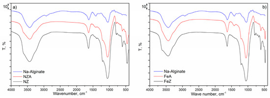 Fourier transform infrared (FTIR) spectra of the Na-alginate and: (a) NZ and NZA; and (b) FeZ and FeA.