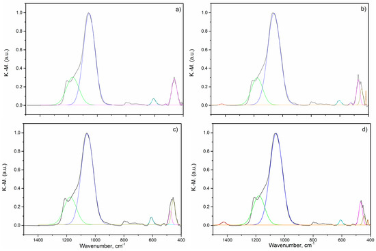 Deconvolution of spectral region between 1500 and 400 cm−1: (a) NZ; (b) NZA; (c) FeZ; and, (d) FeA.