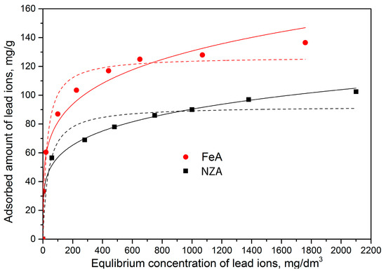 Pb2+ adsorption isotherms for the NZA and FeA. Solid lines (Freundlich model) and dashed lines (Langmuir model).