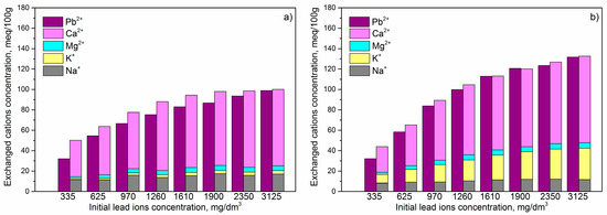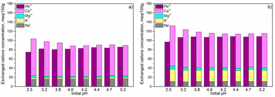 Results from Figure 8 showed that, for all the initial pHs, the total amounts of exchanged cations was higher than the amount of removed Pb2+. That means that pH had no influence on the adsorption mechanism, and ion exchange was the only mechanism included in removal of the Pb2+ for all initial pHs. For both the adsorbents, for the pHi = 2.5, the total amount of the released cations was much higher than removed Pb2+ concentration, confirming that H+ together with Pb2+ from solutions participate in ion exchange with exchangeable cations. Due to decrease of H+ concentration, and therefore their competitiveness, increasing of the pHi up to 4.0 decreased the difference between amounts of the total exchanged cations and removed Pb2+. For the pHi > 4.0 concentration of H+ was lower than 0.1 mmol/dm3, which is much lower than concentration of the Pb2+ in solution (~7 mmol/dm3), and consequently, their competitiveness was negligible. For that reason, almost stoichiometric ratio of the total concentration of the exchanged cations and removed Pb2+ was observed. Also, for all the initial pHs, for both of the adsorbents, the contribution of each individual exchangeable cation in ion exchange with Pb2+ (Figure 8) was the same as it was described in Figure 6, indicating that pHi had no influence on the accessibility of individual exchangeable cations.