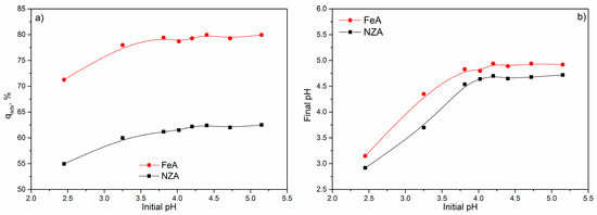 As it is shown in Figure 7a, the removal of Pb2+ from solutions slightly increased (from ~55% to ~61% for the NZA and from ~72% to ~79% for FeA) with an increasing of the pHi from 2.5 to 3.8. Further increase of the pHi from 3.8 to 5.2, for both of the adsorbents, had no significant influence on the removal of Pb2+, and adsorption reached a maximum (~63% for NZA and ~80% for FeA). Increasing of the adsorbed amount of Pb2+ for ~8%, for both adsorbents, when pHi increased from 2.5 to 5.2, indicated that initial pH does not have a significant influence on the adsorption capacities of adsorbents. However, slightly higher removal of Pb2+ was obtained for pHi higher than 3.8, for NZA and FeA. These results are in accordance with our previous results [40], where it was shown that initial pH had no significant influence on the removal of Pb2+ by NZ and FeZ, and the highest removal is achieved for initial pH > 4.0.
