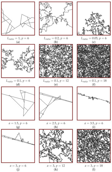 Interconnected fracture networks for the domains whose fracture lengths are defined by (a–f) a uniform distribution with ; and (g–l) a power-law distribution.