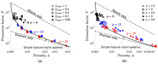 Figure 2a,b show that the relationship between F and for both complex (symbols) and simple (full black line) fracture–matrix systems is more complicated than Archie’s law applied to either pure matrix (, “Matrix only”) or pure fractures (, “Fractures only”) configurations. The behavior of fracture–matrix systems is somewhere between these two laws where the contrast in topological and electrical properties between fractures and matrix impacts the effective electrical properties. More precisely, the analytical solution for simple fracture–matrix systems shows (i) a strong decrease in F when ranges from 0.005 to 0.006, corresponding to configurations where adding fractures to a pure matrix system leads to small changes in and large changes in F, because fractures are, at the same time, small and highly conductive structures in comparison with the matrix; and (ii) a slower decrease in F when is larger than , corresponding to configurations where the electrical properties are mostly determined by the fractures that are already present in the system, implying that adding new fractures leads to relatively small changes in these properties. This is also observed for complex fracture–matrix systems, except for sparse fracture networks with small fractures (i.e., with small values of and large values of a), implying that additional analysis is required to understand the complex fractured media considered in this study.