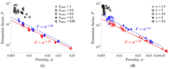 Electrical formation factor F plotted as a function of porosity with the fracture lengths being defined from uniform (left column) and power-law (right column) distributions. The fracture networks are generated with the percolation parameter , 12 and 18 (black, blue and red symbols, respectively), and we consider 5 simulations for each combination of the parameters {,p} and {a,p}. The relationship between F and is compared to (a,b) values obtained for simple configurations that are described in the text, and (c,d) models based on Archie’s law that are described in Table 1.