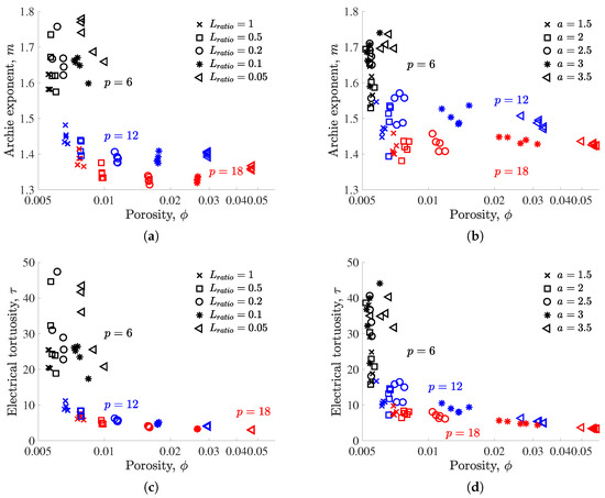 (a,b) Archie’s exponent m and (c,d) electrical tortuosity plotted as a function of porosity with the fracture lengths being defined from uniform (left column) and power-law (right column) distributions. These electrical parameters are computed from the results presented in Figure 2.