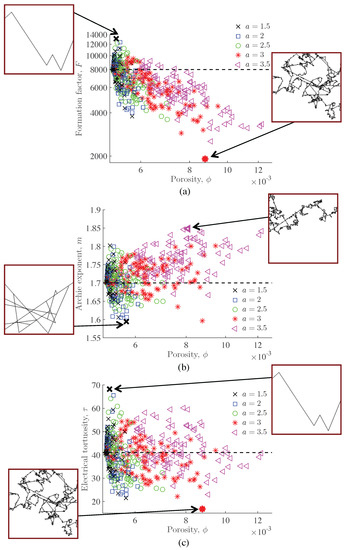 (a) Electrical formation factor F; (b) Archie’s exponent m; and (c) electrical tortuosity plotted as a function of porosity with the fracture lengths being defined from a power-law distribution and the generated fracture network being at the percolation threshold. We consider 100 simulations for each value of a and represent the systems leading to the minimum and maximum values of each electrical parameter. The dashed black lines correspond to the reference values , and .