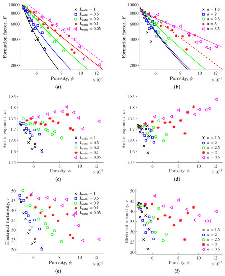 Averaged (a,b) electrical formation factor F; (c,d) Archie’s exponent m; and (e,f) electrical tortuosity plotted as a function of porosity from the results presented in Figure 4 and Figure 5 (left and right columns, respectively). In (a,b), the best fit between the models (dashed lines), (dashdot lines), and (solid lines) is shown for each family of fractures and the corresponding model parameters are presented in Table 2.