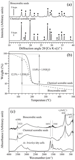 Figure 1. Characterization of bioscorodite and chemical scorodite by XRD (a), TG-DTA (b) and FT-IR (c) analyses. (a) The symbol ● is assigned to scorodite (JCPDS 37-0468). (b) The structural water content was calculated based on the weight loss at 125–250 °C of bioscorodite (broken line) and chemical scorodite (solid line). (c) Dotted lines at 417 and 824 cm−1 can be assigned to AsO43− stretching vibration (436 and 825 cm−1) [21] and those at 3523 and 3517 cm−1 to OH stretching vibration (3511 cm−1) [22]. Two peaks at 1541 and 1653 cm−1 are attributed to cell proteins (1545 and 1654 cm−1) [23].